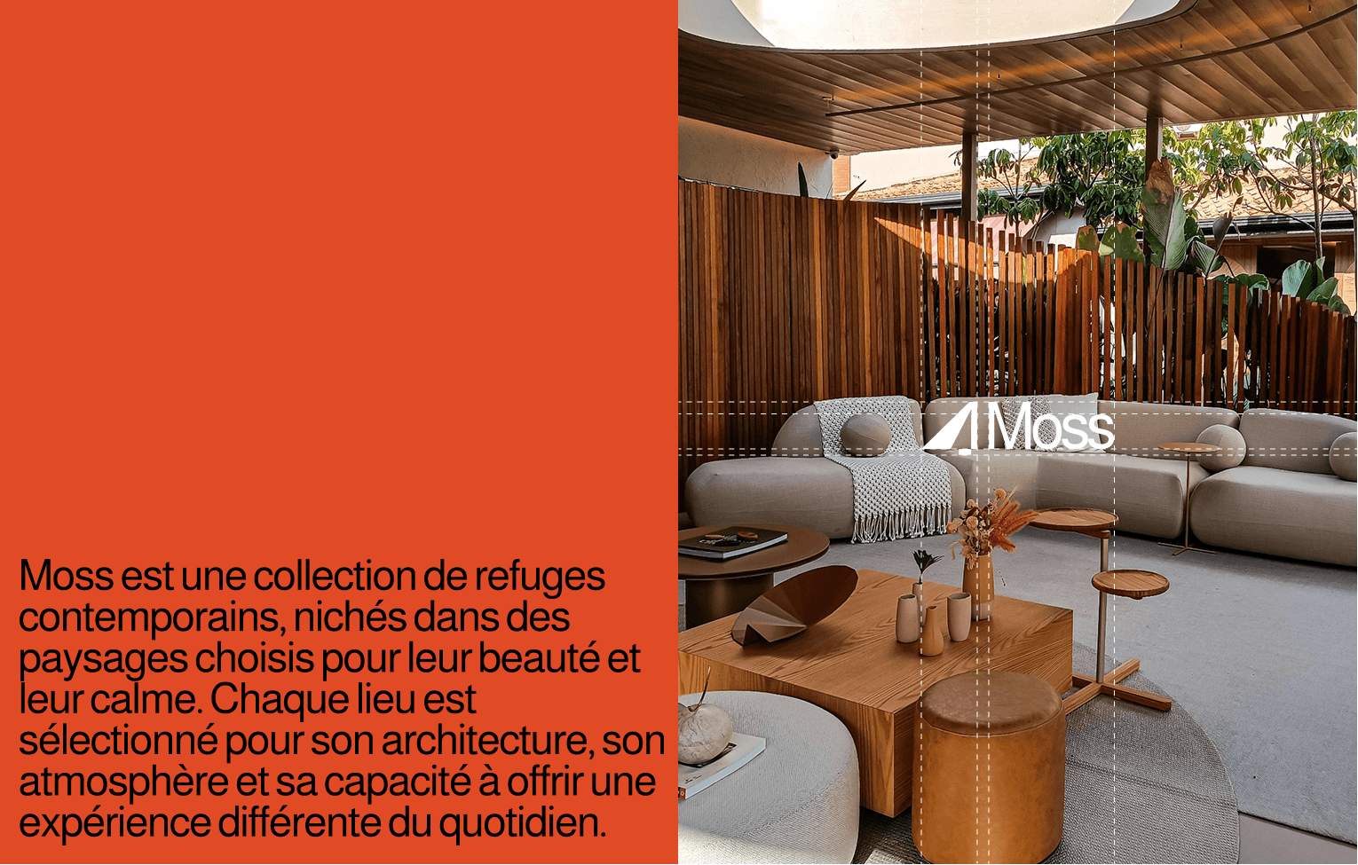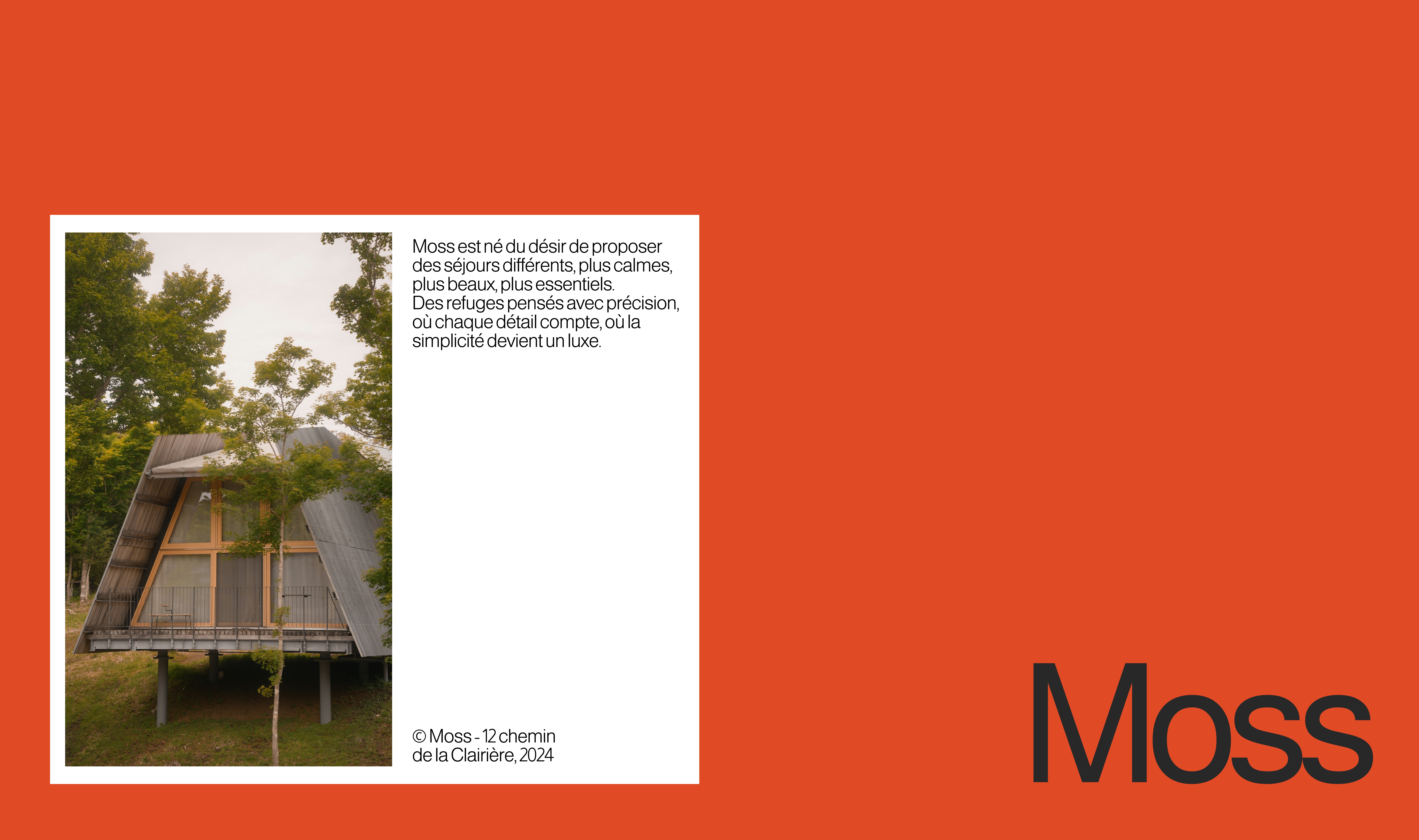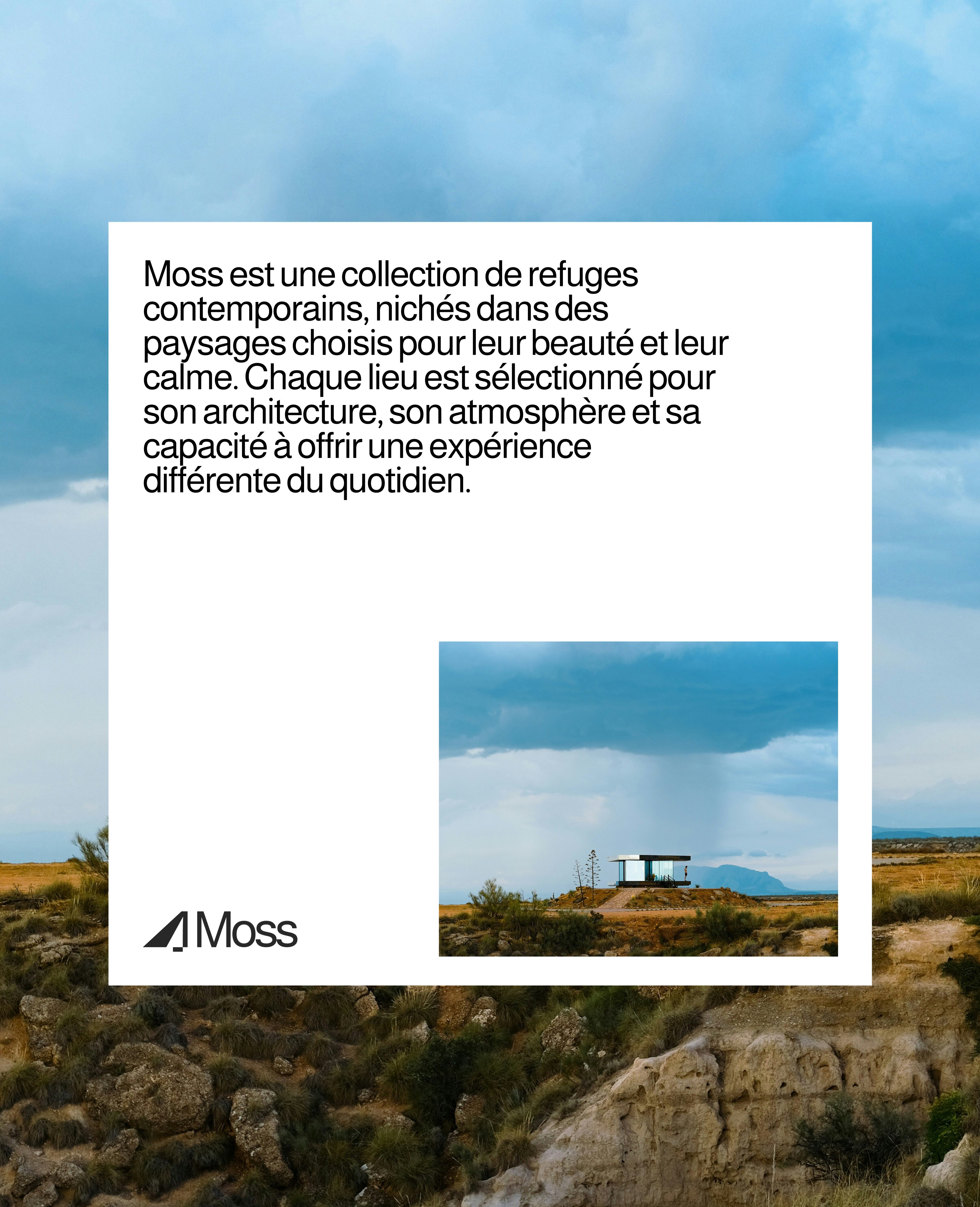 Moss est une collection de refuges contemporains, nichés dans des paysages choisis pour leur beauté et leur calme. Chaque lieu se distingue par son architecture, son atmosphère et sa capacité à offrir une expérience singulière, en rupture avec le quotidien.