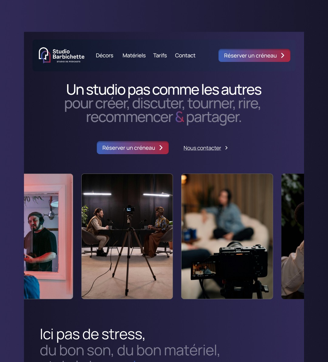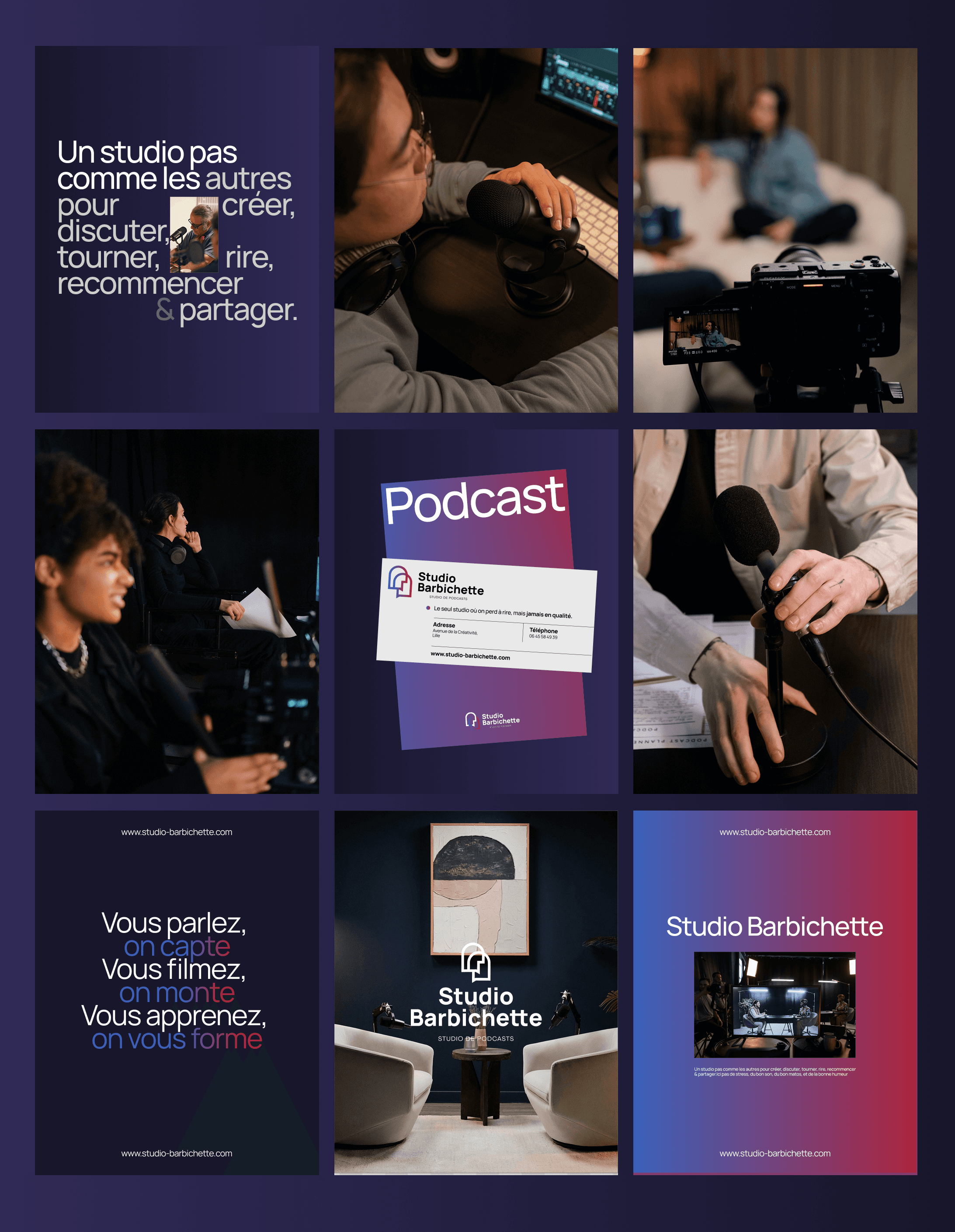 Conception de l’identité visuelle et du site web pour Studio Barbichette, un studio dédié à la création de contenus vidéo et audio. Le projet s’articule autour d’un positionnement à la fois créatif et technique, visant à traduire la polyvalence du studio à travers une image de marque cohérente, immersive, techniques.
